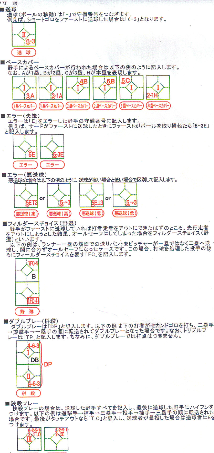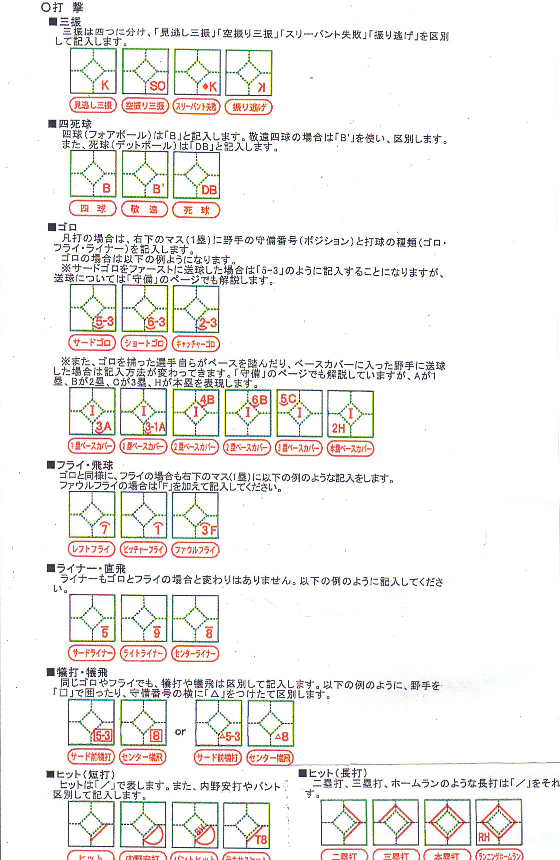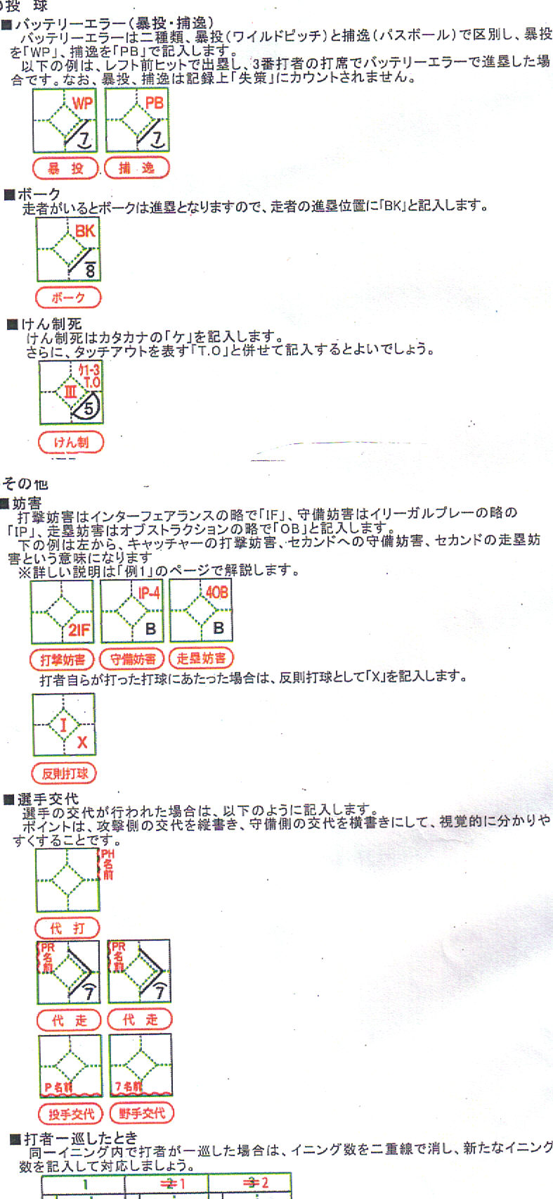 スコアブックの記入方法を掲載します、試合中は交代してつけられるよう